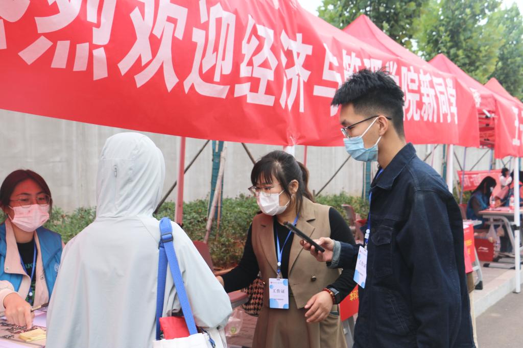 报到完成后,新生们纷纷去往带有经“新”有你,经“心”为你字样的背景板签名拍照,与两位志愿者装扮的迎新财神合影,留下开学第一天的珍贵记忆。