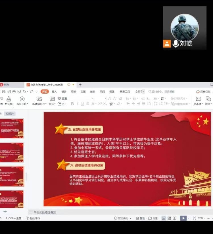 为扎实推进bat3652022年度秋季征兵工作,让广大同学充分了解此次征兵政策,7月9日与10日晚,bat365中文官方网站通过线上会议的形式召开了2022年度在校大学生及毕业生秋季征兵宣讲会,两场征兵会议由bat365辅导员李家家主持,bat365国防教育部退役士兵何金泰、刘屹主讲,bat365全体男生参会。