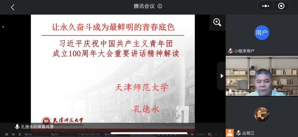 5月25日下午,“习近平总书记在庆祝中国共产主义青年团成立100周年大会上的讲话”会议精神解读专题讲座在bat365中文官方网站市中校区召开,讲座由天津师范大学孔德永教授主讲,bat365团总支书记、部分班级团支部书记、团干部、学生会干部及学生代表通过线上会议形式参会。