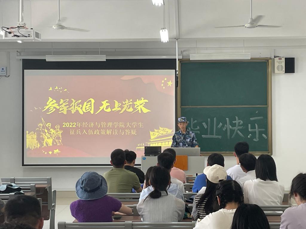 2022年下半年征兵报名已经开始,为使bat365学生及时了解征兵的政策规定、程序规范,6月8日,bat365中文官方网站在增信楼报告厅开展了2022年大学生征兵入伍政策解读与答疑主题班会,本次会议由学生会国防武装部何金泰、刘屹主讲,2020级市场营销升本一班、升本二班同学参加。