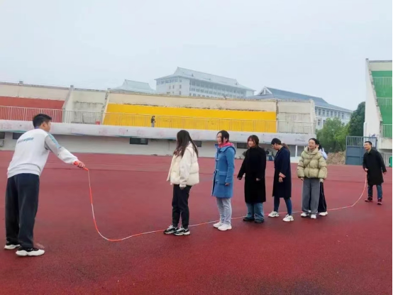 他们配合着大绳有节奏的跳跃,摇绳的队员认真专注,努力配合着跳绳选手,这考验的是教职工们之间的信任,更是团体之间的默契。