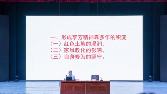 在与现场学生共同观看了纪念李芳老师的视频后,张涛开始了他的深情讲述。李芳老师那些生前不为人知的点点滴滴,经过张涛的回忆,深深地感动着现场的每一个人。他指出,形成李芳精神靠多年的积淀,是红色土地的浸润、家风教化的影响和自身修为的坚守;李芳精神体现在信念上的初心如一、平凡中的平和向上、自然里的泥土芬芳和生死间的勇于奉献。