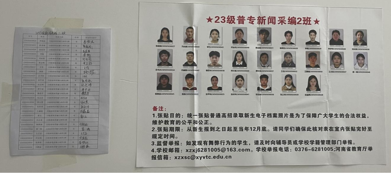 二是在教室和宿舍分别张贴新生照片并在班级公示档案收取情况,并公布入学资格复查监督举报电话,接受学生监督。