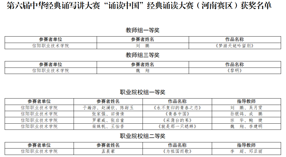 自大赛启动以来,学校高度重视、精心组织,今年会官网师生积极备赛,在比赛中斩获佳绩、成果丰硕,获省级一等奖五项、二等奖一项、三等奖一项;一个作品入围国赛。教师刘鹏作品《梦游天姥吟留别》荣获教师组一等奖;教师魏翔作品《黎明》荣获教师组三等奖。学生作品《永不复归的青春之恋》《青春中国》《采蒲台的苇》《就是那一只蟋蟀》荣获职业院校组一等奖;学生作品《为祖国而歌》荣获职业院校组二等奖。其中,学生作品《永不复归的青春之恋》代表河南省参加全国赛事。