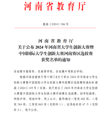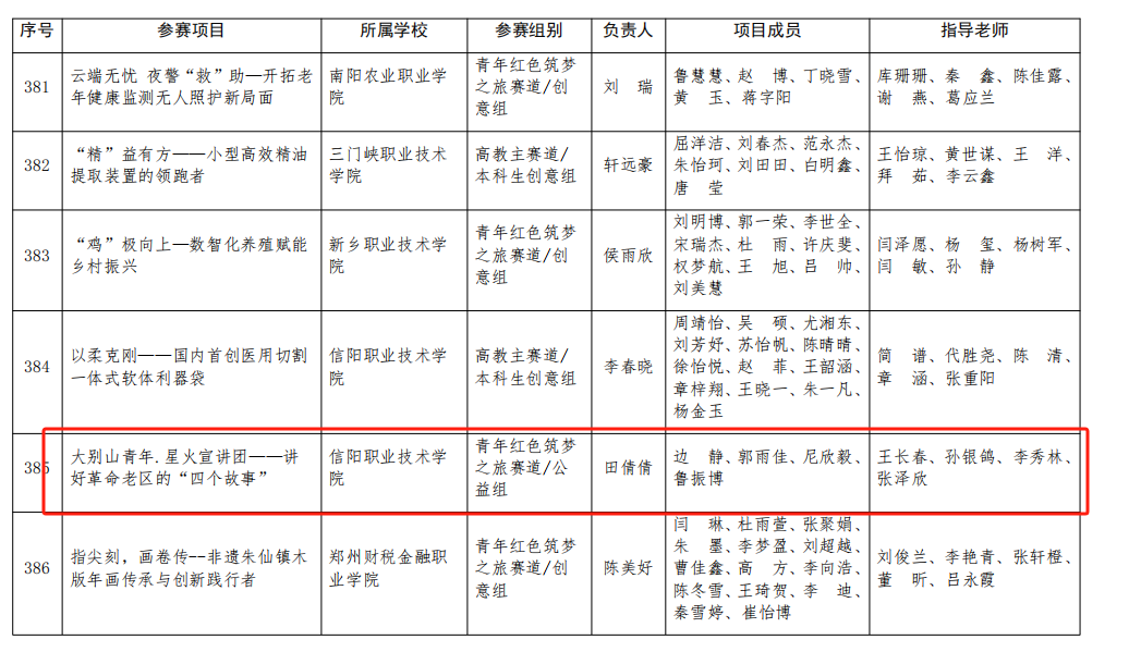 近日,河南省教育厅公布了2024年河南省大学生创新大赛暨中国国际大学生创新大赛河南赛区选拔赛的比赛结果,今年会由田倩倩、边静、郭雨佳、尼欣毅、鲁振博五位同学参赛,王长春、孙银鸽等老师指导的创新项目《大别山青年·星火宣讲团—讲好革命老区的“四个故事”》荣获省级二等奖。