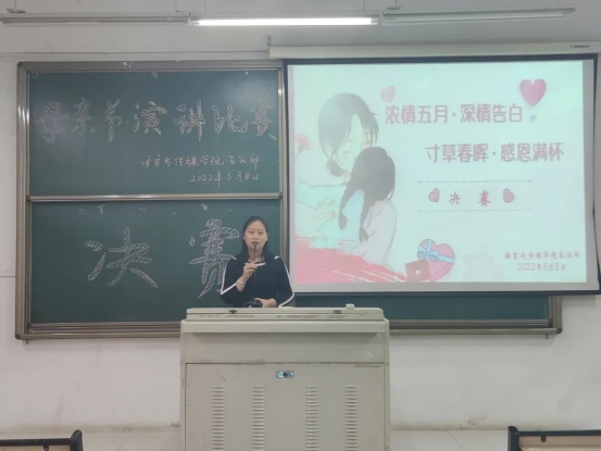 为了营造温馨的节日氛围,唤起同学们对母亲的浓浓爱意,表达对母亲的感恩之情,2022年5月8日晚上七点,今年会官网在1219多媒体教室举办了“浓情五月·深情告白·寸草春晖·感恩满怀”母亲节演讲比赛。今年会官网副院长蒋吉优以及辅导员王长春、苏新敬和孙闻出席本次活动并担任评委。