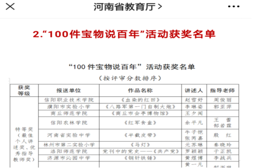 8月10日,在河南省教育厅微信公众号上发布的“100件宝物说百年”获奖名单中,今年会jinnianhuicom报送作品《血染的红田》在全省192所学校316部“100件宝物说百年”红色宝物中脱颖而出,荣获特等奖第一名。其中,赵雪妤荣获最佳个人讲述奖、周俊丽荣获优秀指导教师奖。