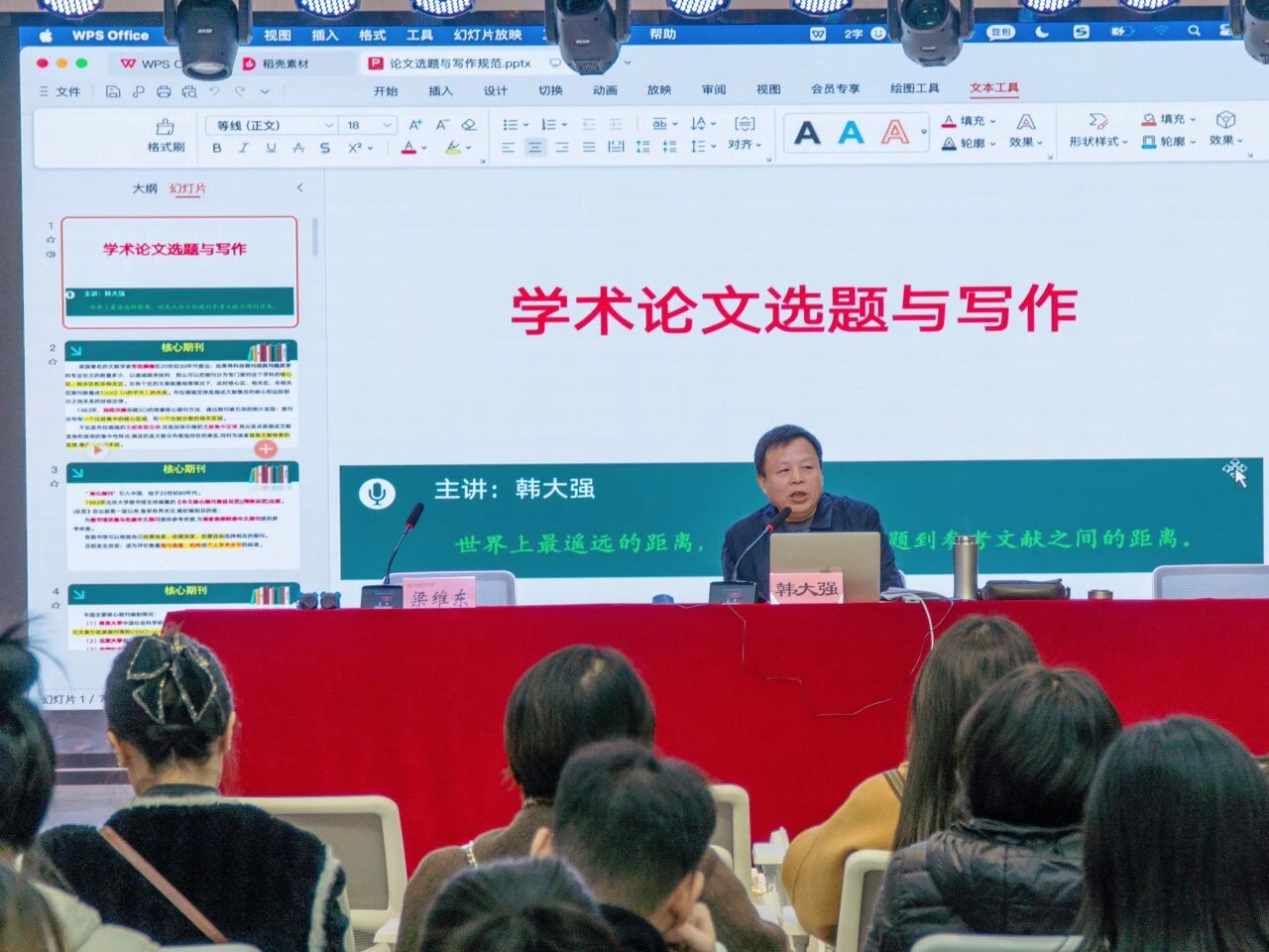 为切实提升今年会教师的学术论文写作能力,营造浓厚学术氛围,深化科研交流与合作,进而推动学科建设与科研工作的高质量发展,10月24日下午,语言传媒学院特邀信阳师范大学韩大强教授于1003演播室举行“学术论文选题与写作规范”专题学术报告。语言传媒学院副院长梁维东及45岁以下全体教师参加了报告会。
