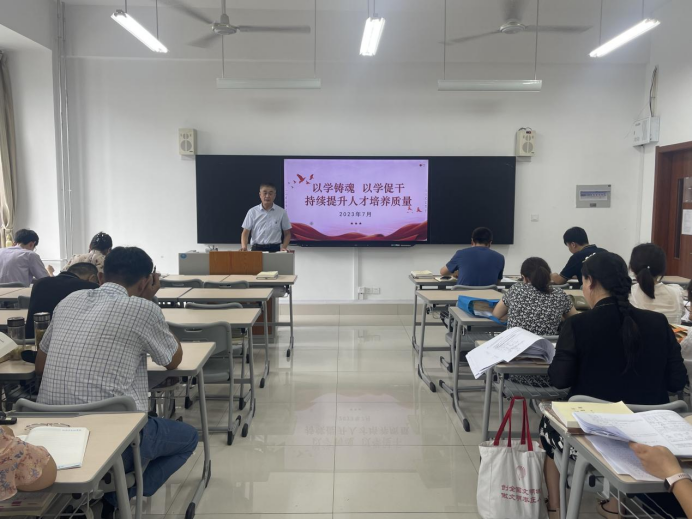 为深入开展学习贯彻习近平新时代中国特色社会主义思想主题教育,坚定办好人民满意的高等教育,7月13日,bat365中文官方网站党总支副书记、院长刘振宇以《以学铸魂以学促干持续提升人才培养质量》为题讲授主题教育专题党课,经管学院全体教职工参加。