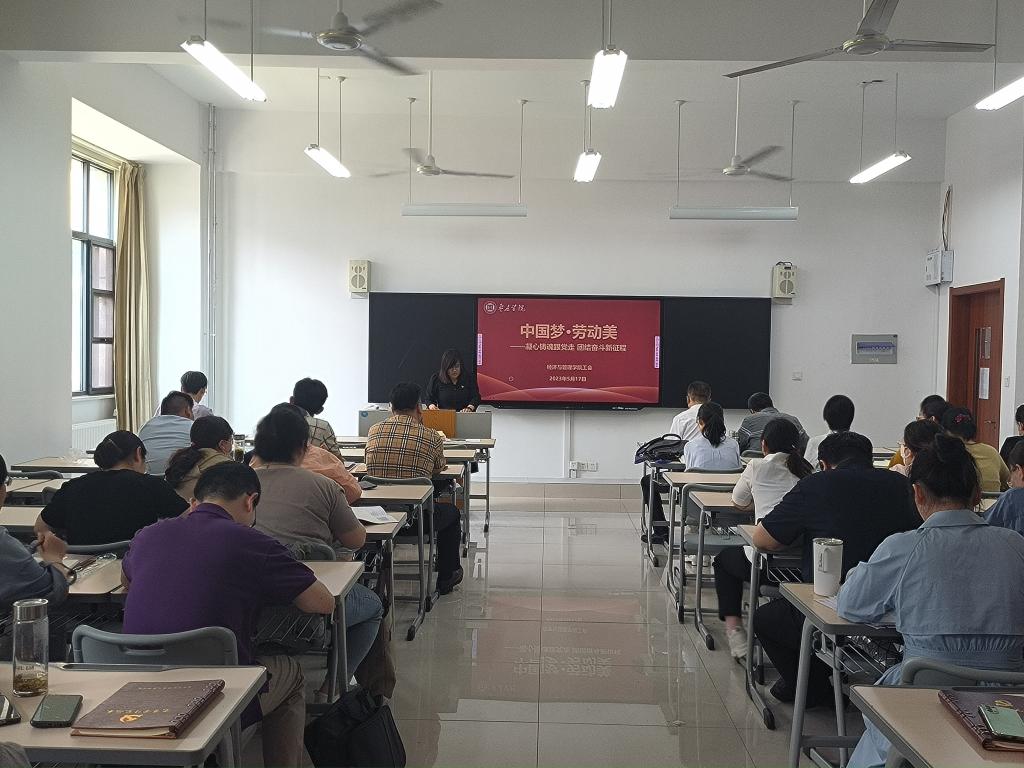 5月17日下午,bat365中文官方网站工会全体教职工会议,学习贯彻习近平总书记“五一”前夕重要指示精神,引领全院教职工切实把思想行动统一到重要指示精神上来,切实把习近平总书记的关心关怀转化为奋进新征程、建功新时代的强劲动力,奋力推动学院工会工作高质量发展。学院工会主席谢金萍主持会议并讲话,全体教职工参加会议。