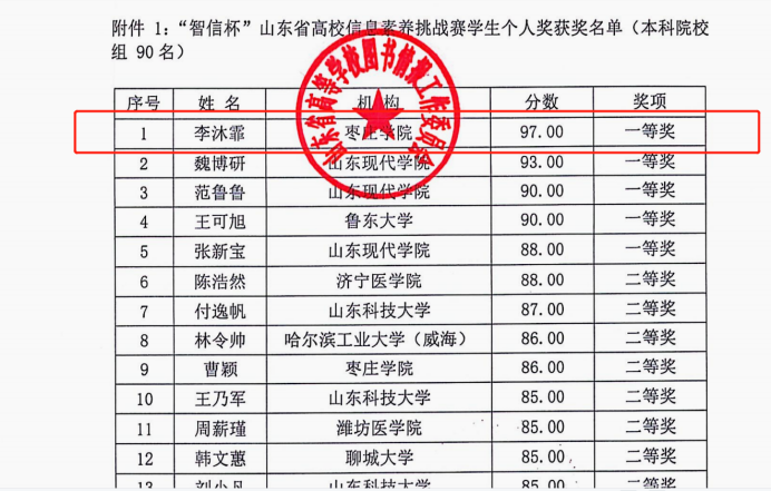 bat36521经济统计学本科1班李沐霏在第二届“智信杯”山东省高校信息素养挑战赛中荣获学生个人奖一等奖,并为山东省本科院校组第一名。